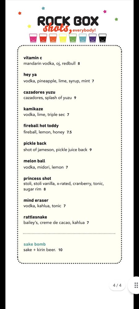 “ I frequent Rockbox a few times out of the year. Its always a good time and service is always spectacular. The drinks are good but pretty strong. Havent eaten much here but the spam musubi is tasty! I love having private rooms! ”
